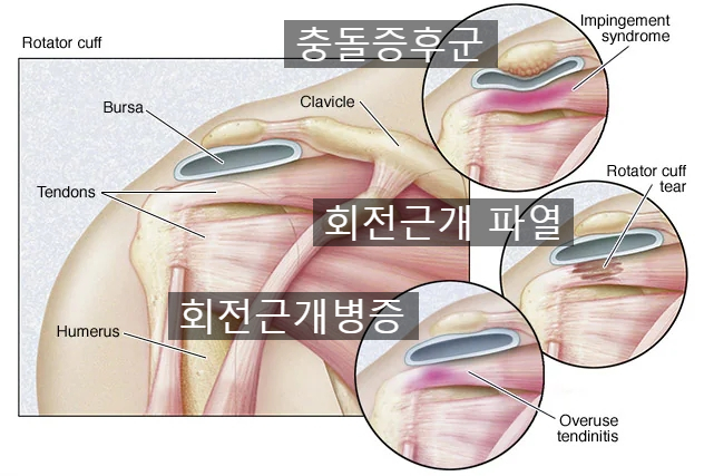 회전근개증후군: 힘줄 손상 보호 → 주사치료, 체외충격파, 도수치료를 통한 재활운동